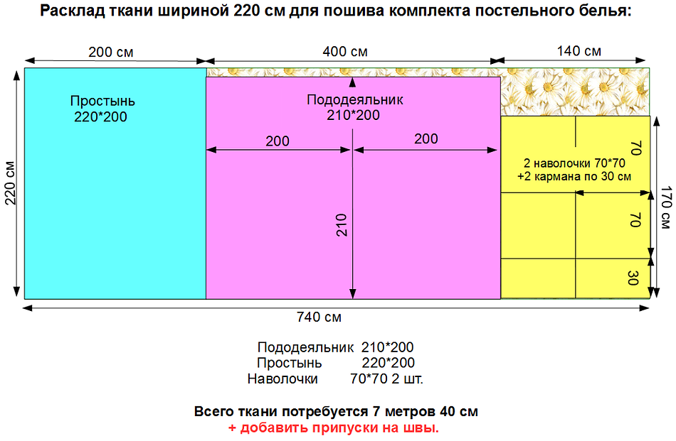 - пододеяльник — две длины одеяла 200 см х 2 + 5 см (на шов) = 405 см;