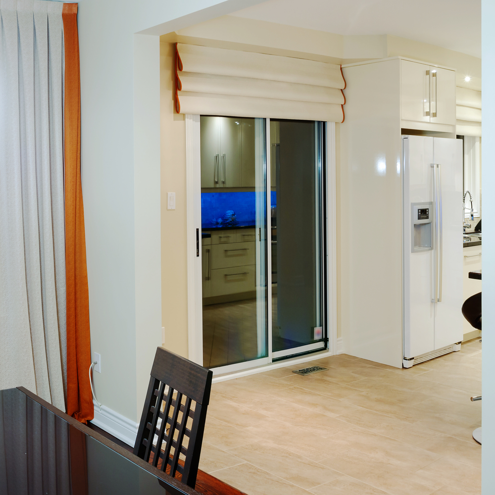 - Для кухни с дверью на балкон хорошо подходят римские шторы. У них горизонтальная драпировка, позволяющая регулировать высоту. Такие занавеси и от солнца защитят, и окно украсят, и хождению на балкон не помешают. Более того, римские шторы могут быть опущены на разную длину. Если у вас стеклянная балконная дверь, ее можно закрыть полностью. Окна при этом могут быть прикрыты частично. Умное и красивое решение.