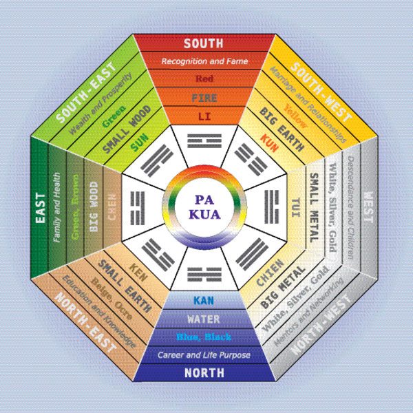 Огонь и вода символизируют Инь (север) и Ян (юг) – женское и мужское начало. Дерево, земля и металл могут быть выражены как Инь, так и Ян, в зависимости от стороны света, в которой активируют эти элементы: